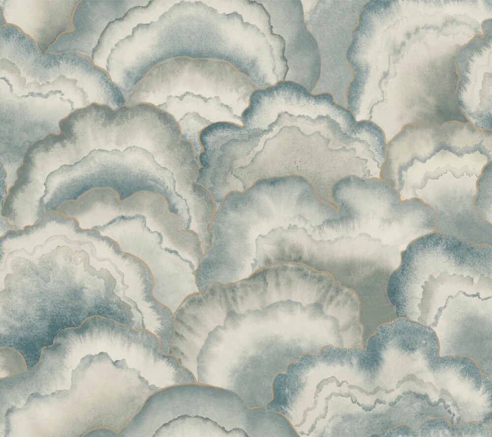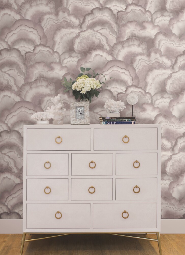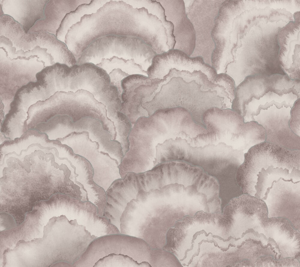 Watercolor demilune shapes create layers of soft, natural semicircles on the pattern Abalone Fans, shown in thistle lavender, with nickle metallic.