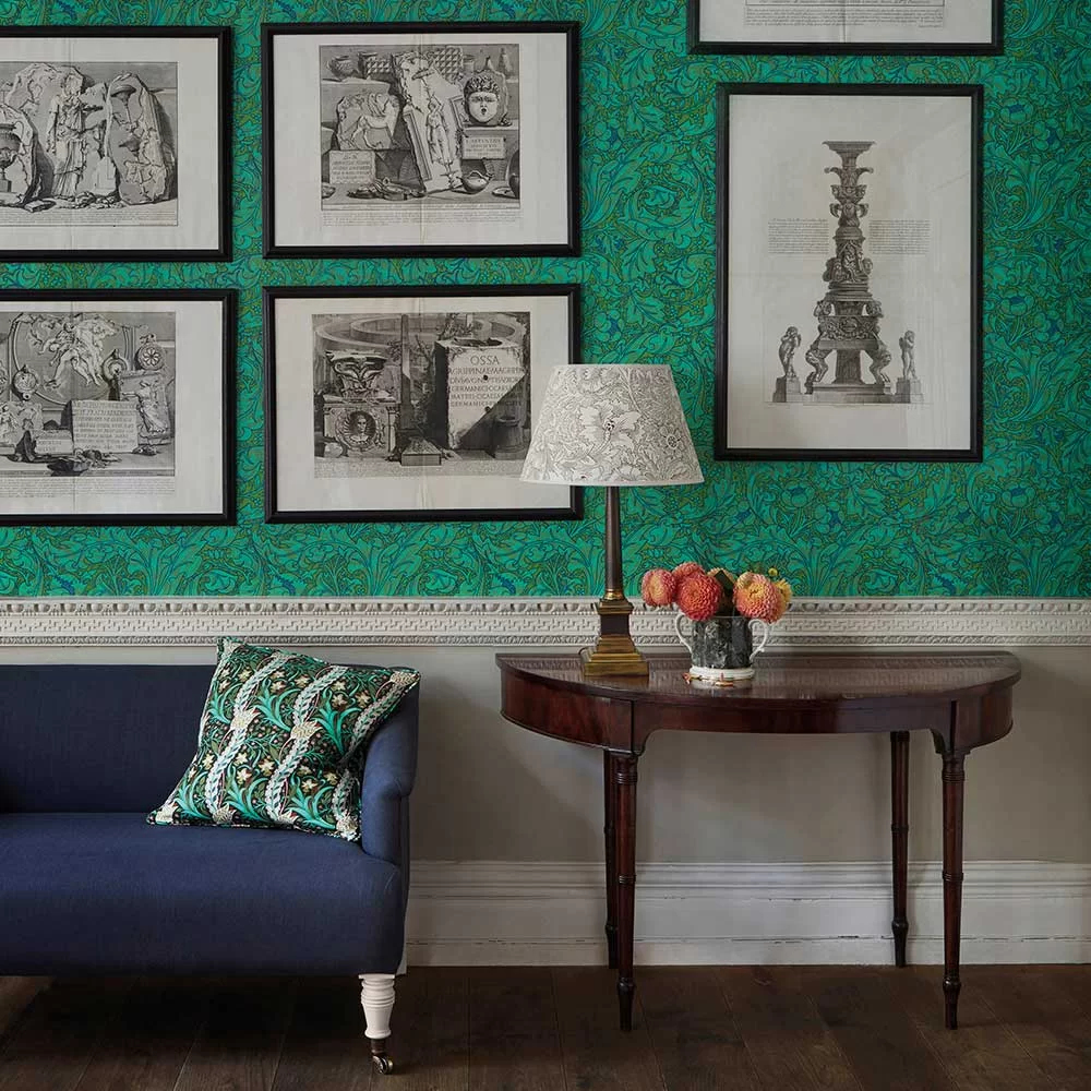 A striking but simple design, with acanthus leaves scrolled around stylised cornflower blooms – a true country classic pattern.