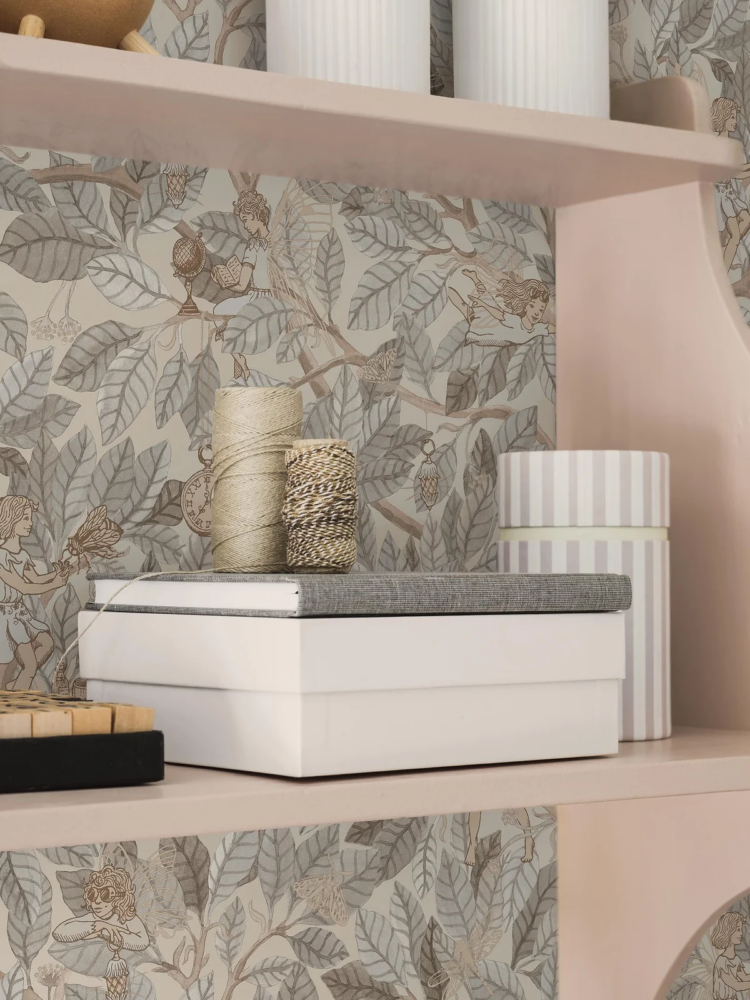 Envelop your walls in the soft grey tones of our Fairies wallpaper, where delicate grey-beige leaves form a dense, hand-painted watercolour forest canopy. At first glance, the design appears as a serene forest scene, but as light falls, shimmering gold details reveal hidden fairies, dragonflies, and tiny lanterns.