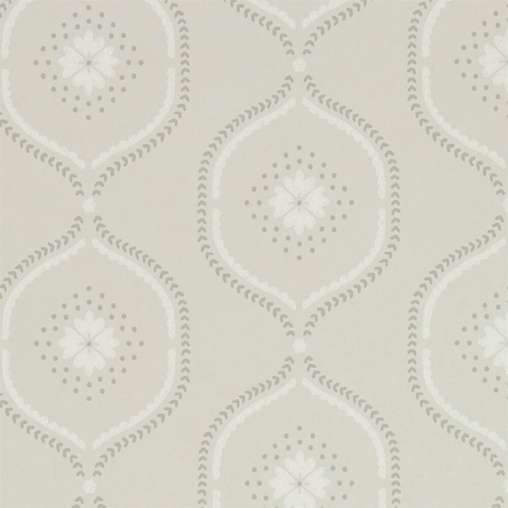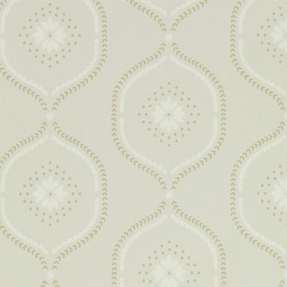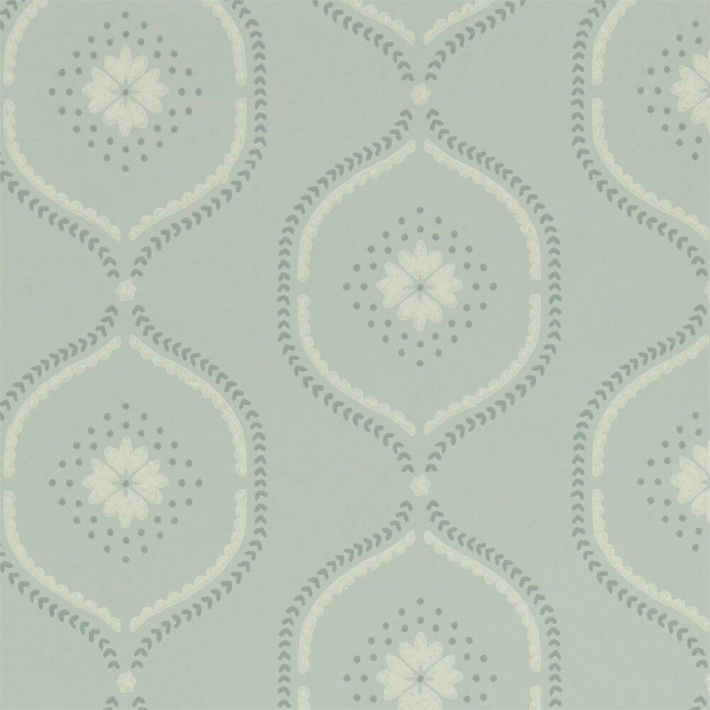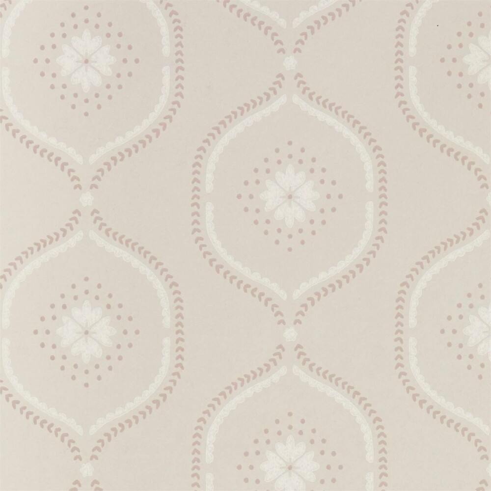 With a chalky ground and hand block printed look, this wallpaper’s stylised ogee trellis houses a delicate flower and decorative dots across its pretty, feminine colour palette.
