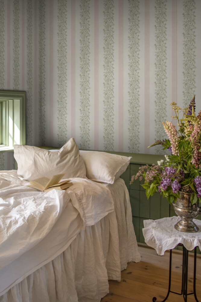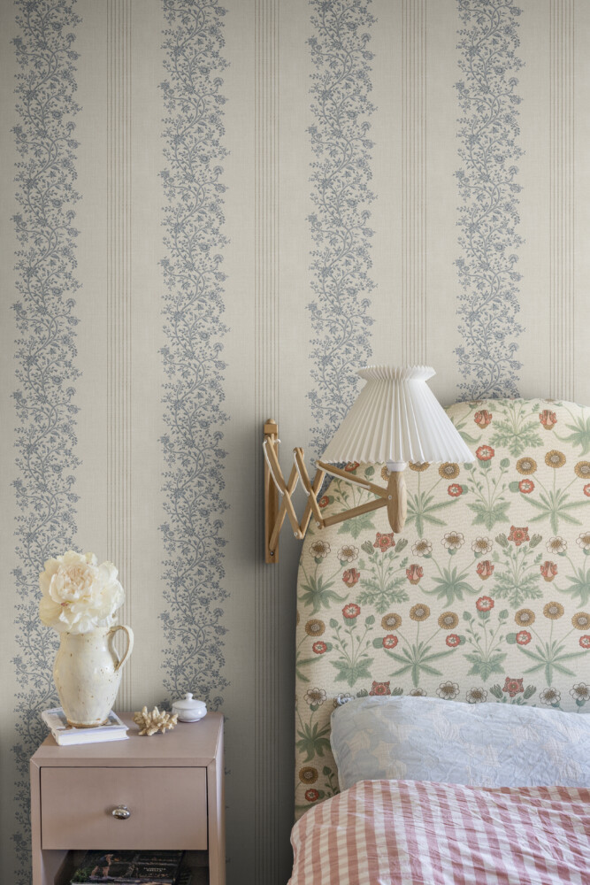 Natalie wallpaper in blue brings a touch of the French countryside to your walls. With gentle blue floral garlands combined with refined stripes, it offers a timeless and elegant look. Perfect for adding a romantic and charming style to any room.