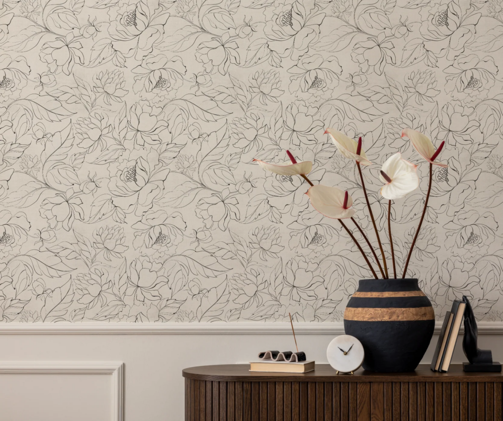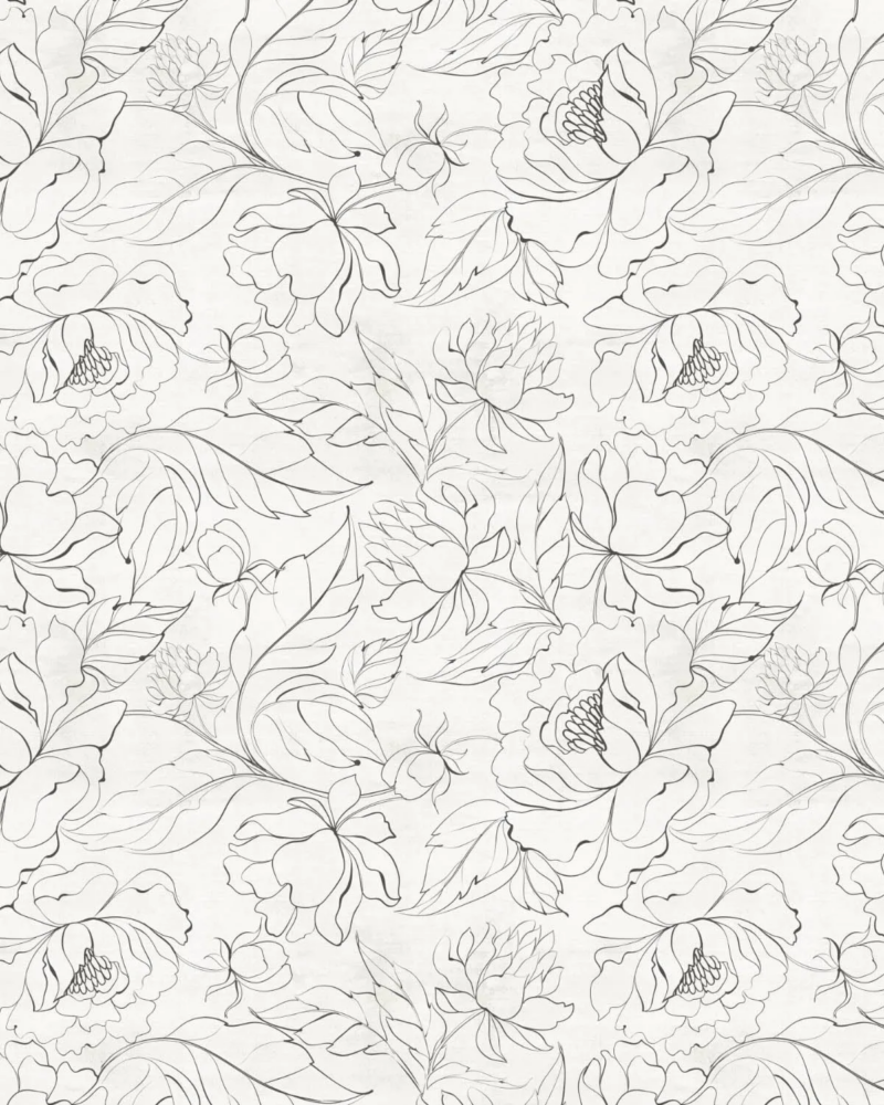 Delicate black linework on a crisp white background showcases intricate botanical illustrations, creating a sophisticated and airy ambiance.