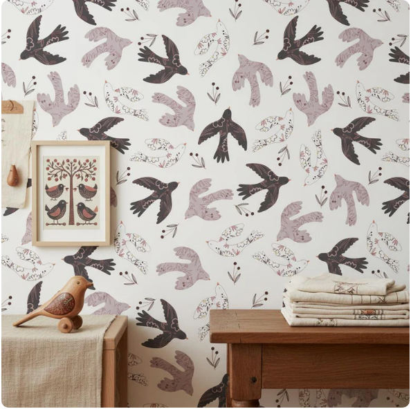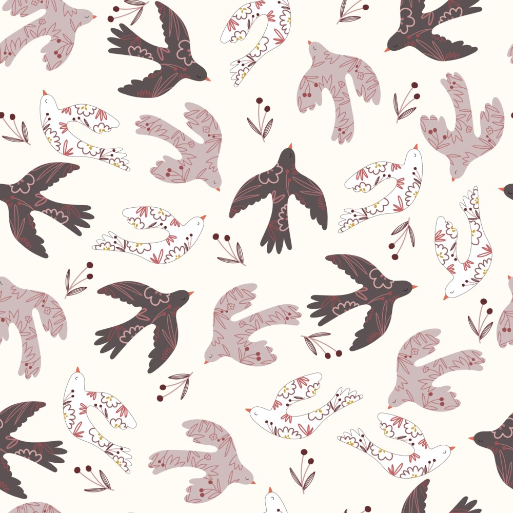 Graceful swallows and songbirds in charcoal, dusty mauve, and ivory glide across a warm cream background, accented by delicate botanical sprigs. Hand-painted in a soft watercolor style with folk art charm, this seamless pattern brings warmth and whimsy to any space — from nurseries to living rooms.